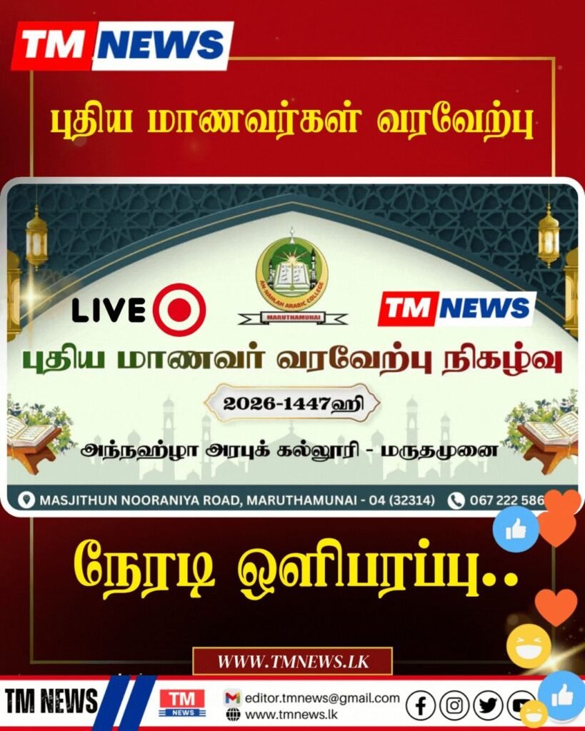 மருதமுனை அந்-நஹ்ழா அறபுக் கல்லூரியின் முதலாம் கட்ட நேர்முகத்தேர்வில் தெரிவான 22 புதிய மாணவர்களை எமது கல்லூரியில் இணைத்துக் கொள்ளும் நிகழ்வும் அவர்களுக்கான வரவேற்பு நிகழ்வும் இன்ஷா அல்லாஹ் நாளை (17.01.2026) எமது கல்லூரியில் இடம்பெறுகிறது.